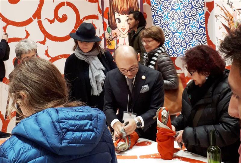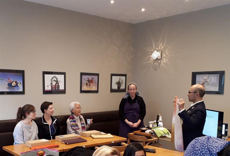 フランスで包み方を教える小山さん
